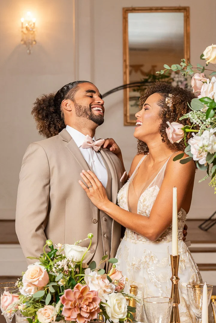 Gold candelabras cast flickering candlelight over sumptuous tones of blush, peach, and ivory in this styled shoot organized by Social Shots Photography. The words “Southern Elegance” come to mind, as echoes of the past fuse seamlessly with modern touches in our glamorous 1920s ballroom in the heart of Midtown Atlanta. We’re honored to have worked with such an amazing team of vendors to bring this vision to life!